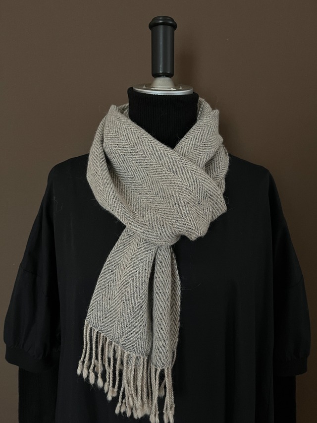 ベビーアルパカとシルクの組み合わせ 〜ふんわり軽くあたたかい〜 ✎ こんな方におすすめ‥‥✍︎ ・色々な巻き方を楽しみたい方 ・カラフルなアイテムを身につけることが苦手な方 ・ナチュラルなモノ、ベーシックなモノを好む方 ・首に何かを身につけることで(ネックレスなどでも)肩こりなどストレスを感じる方 【以下の点が気になる方はカシミヤをおすすめします】 ※黒色の服に合わせると猫ちゃんの毛のような長い繊維がつきやすい ※カシミヤに比べると多少のチクチク感がある 『アッシュグレー』 ヘリンボーン柄に 細かくラインが入ったデザインのマフラーは 少し青みがかったグレーで、カラーも柄も 男性にもおすすめです マネキンの画像で巻いた雰囲気を 卓上撮影の画像で色味を確認してください 『巻きやすいマフラー』 いつも同じ巻き方ではなく 色んな巻き方をして首元のお洒落を楽しんで欲しい!! 巻き物好きの作り手が マフラーのサイズ感、厚さ、糸の柔らかさ 軽さにこだわったマフラーを作りました。 少し薄めのマフラーは決して暖かくない訳ではなく 細い糸を優しくふんわり織る事で 巻いた時に空気を含んであたたかく、 結んだり、色々な巻き方をした時に ゴロっとならない仕上がりです。 軽さにこだわったのは、 冬場に寒さでキュッと縮まる事で悩まされる肩こりの ストレスを少しでも無くしたい! という想いからです。 作り手自身も長く肩こりには悩まされてきて、 同じような方も多いのでは? モコモコの分厚いモノでなくても 『巻き方でこんなにあったかいんだ!』 色々な巻き方をしてみて下さいね⭐︎ 巻き物好きへの第一歩となるアイテムです。 —サイズ— 幅21㎝✖️179.5㎝➕房7㎝ 重さ79g —素材— ベビーアルパカ75% シルク25% —お手入れ方法— 『洗い方』 繊細な織物ですので、手洗いが基本となります。 洗濯機の手洗い機能は、 水に濡れている時間が長い為お勧め出来ません。 洗面器などに入れた洗浄液に浸して、 こすらないように優しく押し洗いして下さい。 洗剤はおしゃれ着用の中性洗剤を使用し、 蛍光剤、漂白剤を含んだ洗剤は避けて下さい。 洗浄液の温度は30度程度のぬるま湯で、 品質を保つ為にも、 長時間水につけない事がポイントです。 洗剤の量も、指定の量よりも少なめの方が 生地を傷めにくいです。 すすぎは水を数回交換しながら、 ゆっくりと押してあげて泡を取り除いて下さい。 『干し方』 手洗い後軽く水切りをして、乾いたタオルで 挟むようにして水気を吸い取ってあげる方法が お勧めです。 軽く水が垂れる状態でも、水が下に向かうことで フリンジまで綺麗に仕上がります。 風通しの良い日陰で干すと、柔らかな風合いも 長持ちします。 —注意事項— 手作業での制作、糸の性質により、 寸法に若干の違いが生じる場合があります。 お使いの端末や閲覧環境により、 写真と実物の色味や質感が多少異なって 見えることがございます。